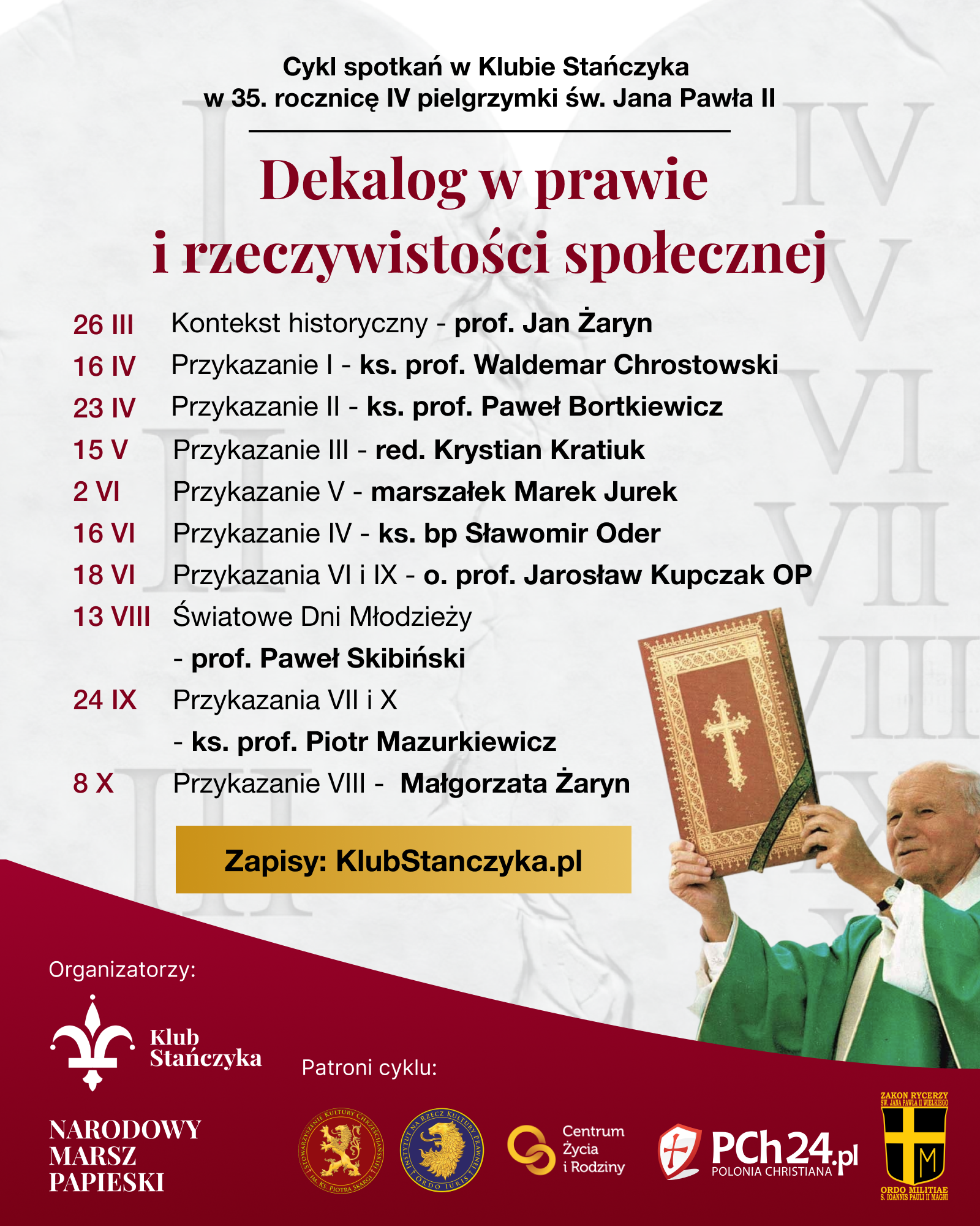 W czwartek w Klubie Stańczyka w Warszawie zainaugurowano cykl spotkań pt. „Dekalog w prawie i rzeczywistości społecznej”, organizowanych z okazji 35. rocznicy IV pielgrzymki Jana Pawła II do Ojczyzny. Spotkanie rozpoczęło się krótkim wprowadzeniem pomysłodawcy cyklu – Pawła Gierecha, socjologa z Instytutu Ordo Iuris i Fundacji Narodowy Marsz Papieski. Przedstawił on diagnozę, że choć Polska jest dziś materialnie bogatsza niż kiedykolwiek, to jednocześnie doświadcza głębokiego podziału wspólnoty, zapaści demograficznej oraz upadku autorytetu państwa i prawa. Przypomniał, że podczas IV pielgrzymki do Ojczyzny w 1991 roku (najbardziej niedocenionej, a kluczowej dla papieskiego nauczania społecznego do Polaków) Papież wskazywał, iż odzyskana wolność jest darem wymagającym zakorzenienia w trwałych wartościach. Bez tego grozi jej wypaczenie – prowadzące do anarchii, rozbicia wspólnoty i dominacji partykularnych interesów, na wzór doświadczeń „złotej wolności szlacheckiej”. W tym kontekście Dekalog – chroniący życie, prawdę, małżeństwo, rodzinę i własność – jawi się jako fundament odbudowy ładu społecznego.
