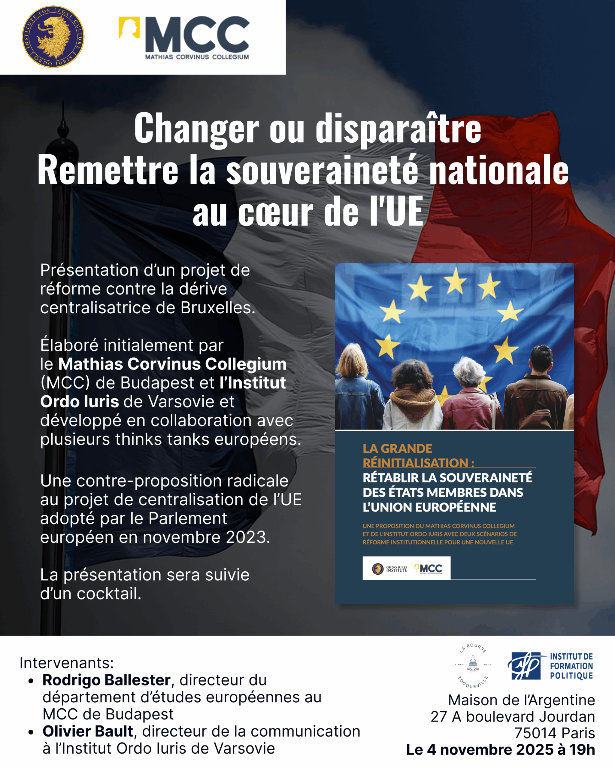 We wtorek w Paryżu Instytut Ordo Iuris i węgierski Mathias Corvinus Collegium (MCC) zaprezentowały francuską wersję raportu „Wielki Reset: przywracanie suwerenności państw członkowskich w Unii Europejskiej”.