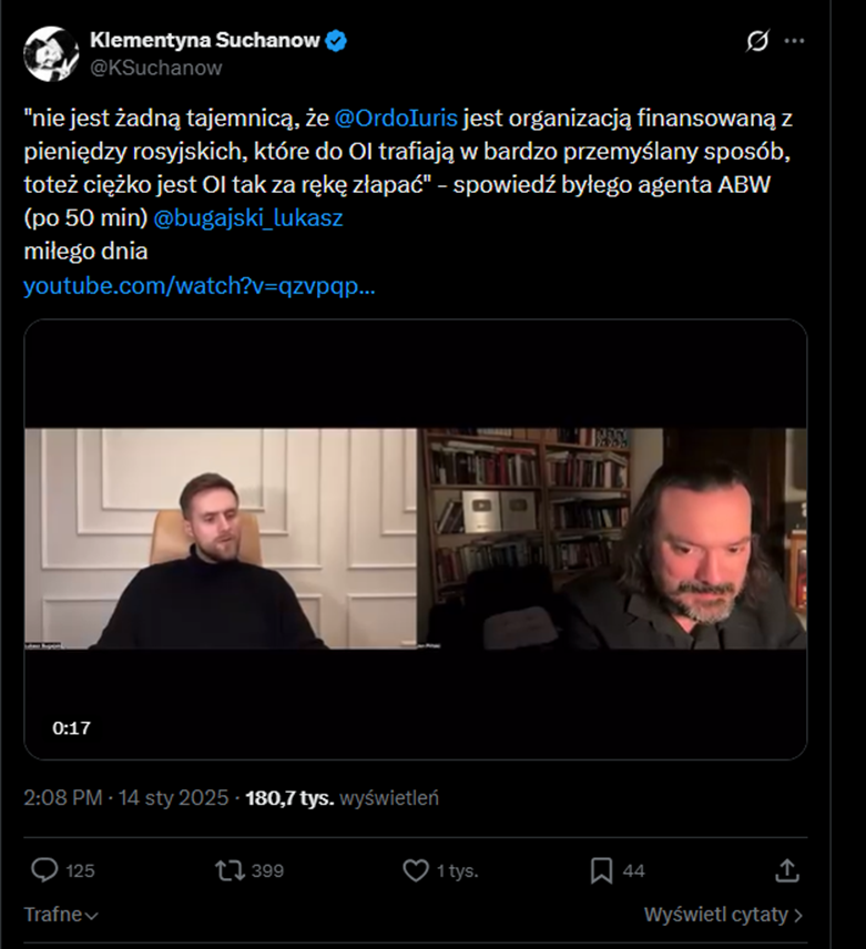 Oczywiście każdy ma prawo do swojej oceny. Ale Bugajski opisuje tutaj po prostu działalność organizacji pozarządowej, która skutecznie prowadzi lobbing na rzecz wartości konserwatywnych – coś, co równie dobrze można powiedzieć o dziesiątkach innych fundacji po różnych stronach sceny ideologicznej. „Zbieżność narracji” jako zarzut jest wyjątkowo pojemna – bo każdy, kto podziela jakiekolwiek poglądy z kimkolwiek, może zostać oskarżony o „zbieżność”. Choć na przykład Ordo Iuris broni życia od poczęcia – a w Rosji jak wiadomo aborcja jest dostępna na życzenie i to nie jest kwestionowane przez rosyjską władze, a to jest akurat bardziej zgodne z narracją pani Suchanow niż z narracją Ordo Iuris. Rzekoma zbieżność narracji, jak widać, nie dotyczy wszystkich istotnych dla polskiego instytutu obszarów.