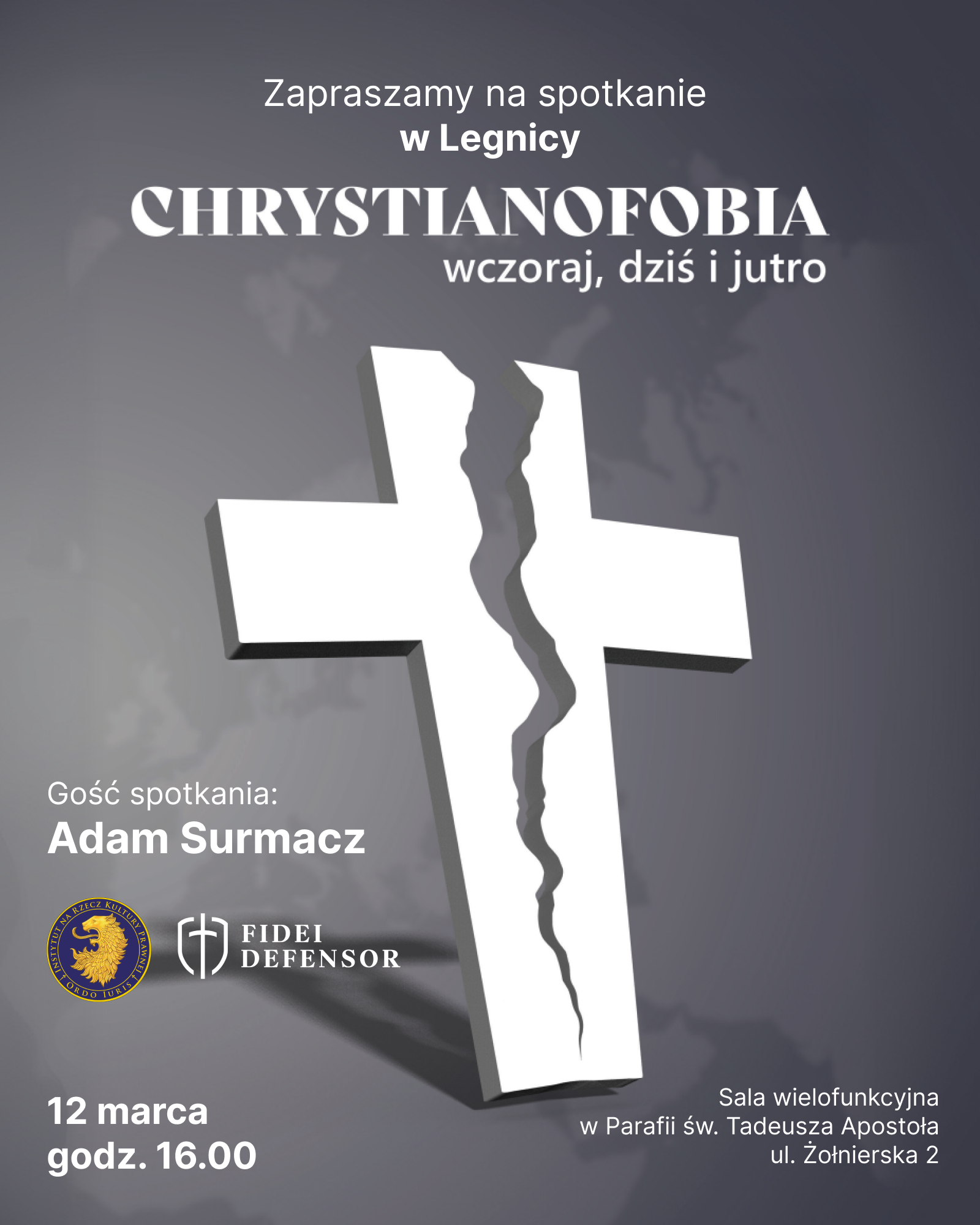W ubiegłym roku w Legnicy ze ściany sali Rady Miasta zdjęto krzyż. To tylko jeden z przypadków rugowania chrześcijaństwa z przestrzeni publicznej. W Polsce dochodzi też do licznych aktów agresji wobec chrześcijan. O swoich doświadczeniach walki z chrystianofobią będzie opowiadał w Legnicy Adam Surmacz ze Stowarzyszenia Fidei Defensor i Instytutu Ordo Iuris.