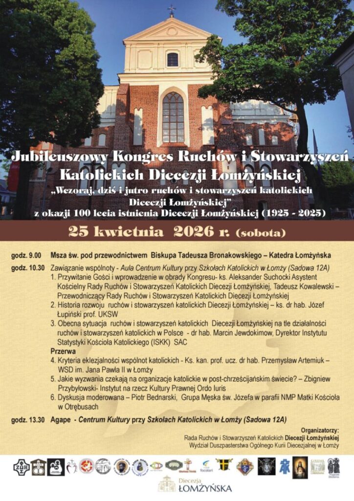 Wydarzenie odbywa się pod hasłem „Wczoraj, dziś i jutro ruchów i stowarzyszeń katolickich Diecezji Łomżyńskiej”. Podczas Kongresu głos zabierze Zbigniew Przybyłowski – dyrektor Ordo Iuris ds. rozwoju. Wygłosi on prelekcję pt. „Jakie wyzwania czekają na organizacje katolickie w post-chrześcijańskim świecie?”. Wydarzenie poprzedzi Msza Święta w Katedrze Łomżyńskiej pod przewodnictwem ks. bp. Tadeusza Bronakowskiego (godz. 9:00).