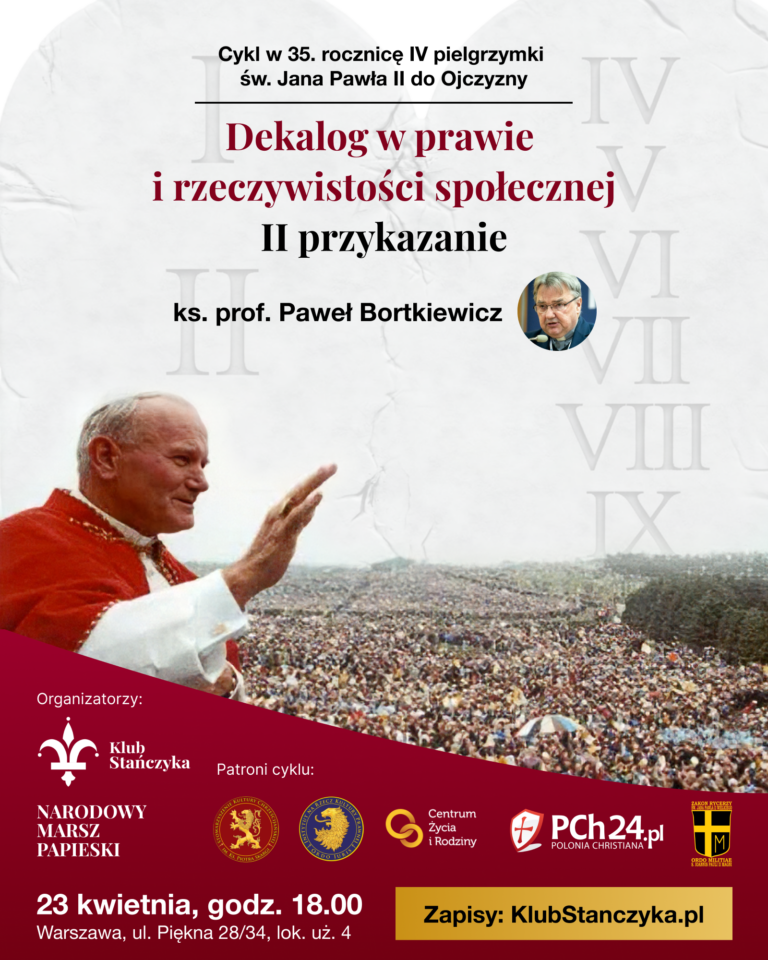 W najbliższy czwartek w warszawskim Klubie Stańczyka odbędzie kolejne spotkanie z cyklu „Dekalog w prawie i rzeczywistości społecznej: 35 lat po IV pielgrzymce św. Jana Pawła II do Ojczyzny”. Gościem będzie ks. prof. Paweł Bortkiewicz – teolog i etyk. Wydarzenie nosi tytuł „Nie będziesz brał imienia Pana Boga twego nadaremno”.
