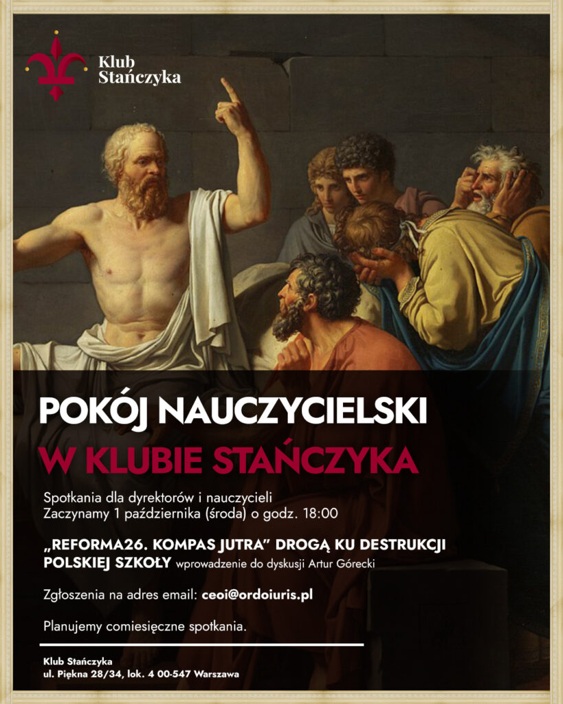 Centrum Edukacyjne Ordo Iuris rozpoczyna cykl spotkań dla nauczycieli i dyrektorów szkół pt. „Pokój nauczycielski w Klubie Stańczyka”. Pierwsze wydarzenie odbędzie się 1 października i będzie poświęcone programowi „Reforma26. Kompas jutra”.