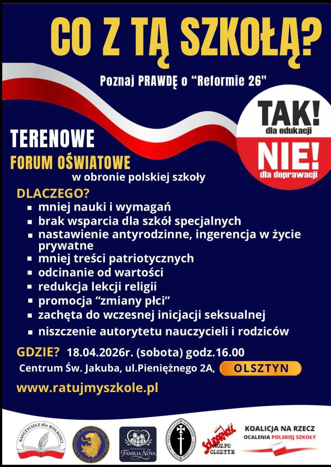 Koalicja na Rzecz Ocalenia Polskiej Szkoły zaprasza na spotkanie w ramach Terenowego Forum Oświatowego. Wydarzenie odbędzie się 18 kwietnia w Olsztynie. Spotkanie będzie dotyczyło prowadzonej przez Ministerstwo Edukacji Narodowej „Reformy26”. Gościem Forum będzie r.pr. Marek Puzio z Instytutu Ordo Iuris.